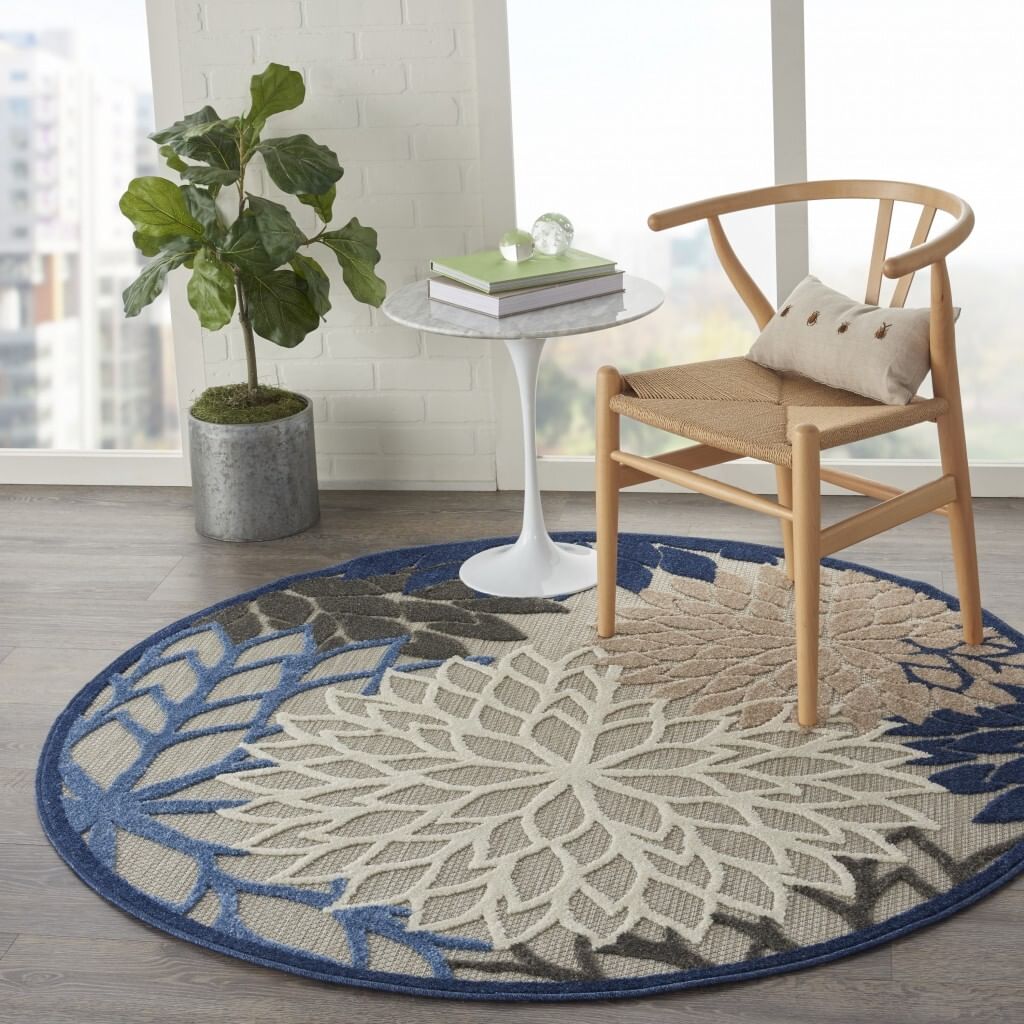 Set an inviting tone in your space with this 4′ round blue and gray round floral indoor outdoor area rug. This geometric round shaped rug features a floral pattern in blue and gray that combines a good looking print with a unique and updated shape. The mix of shape, color, and design gives this rug refreshing visual interest. Made in Turkey, this rug offers high quality combined with good looking designer sensibilities. Area Rugs help to give warmth and sense of home to your space. 1″ H x 48″ W x 48″ D