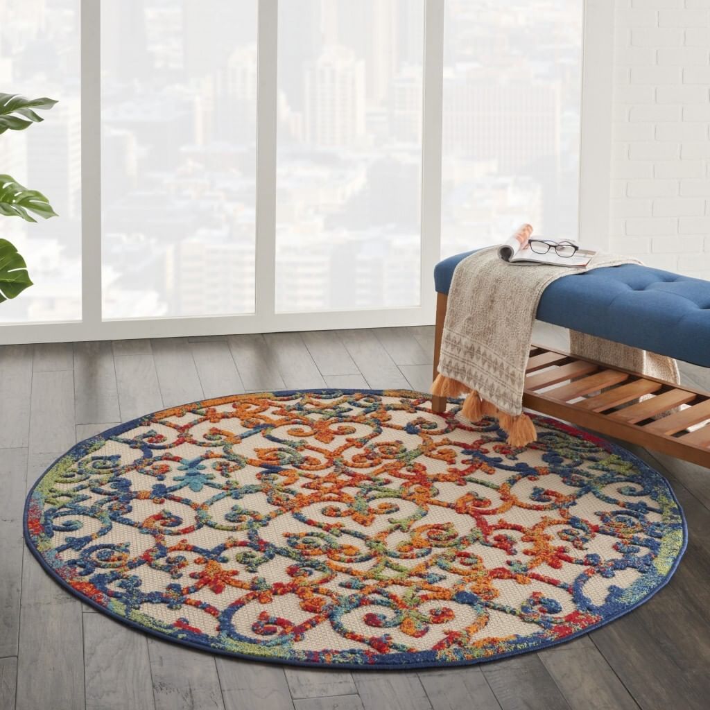 Set an inviting tone in your space with this 4′ round ivory and blue round floral indoor outdoor area rug. This geometric round shaped rug features a floral pattern in ivory and blue that combines a good looking print with a unique and updated shape. The mix of shape, color, and design gives this rug refreshing visual interest. This superior Turkish rug represents the highest quality and is built to last. Area Rugs help to give warmth and sense of home to your space. 1″ H x 48″ W x 48″ D