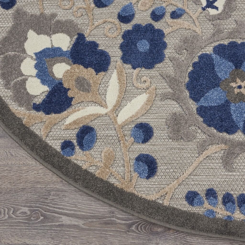 Add some artistry to your room with this 5′ round blue and gray round floral indoor outdoor area rug. This geometric round shaped rug features a floral pattern in blue and gray that combines a good looking print with a unique and updated shape. The mix of shape, color, and design gives this rug refreshing visual interest. Made in Turkey, this rug offers high quality combined with good looking designer sensibilities. Area Rugs help to give warmth and sense of home to your space. 1″ H x 63″ W x 63″ D